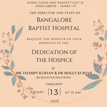 Moved by this dire need, the Kurian Foundation committed to building a state-of-the-art hospice at the Bangalore Baptist Hospital’s Devanahalli Campus. Construction began in 2019, but the global pandemic brought unforeseen delays. Finally, in 2023, the hospice was completed—a 25,000 sq. ft. beacon of hope and dignity. After receiving all statutory licenses, the facility was formally inaugurated by Karnataka’s Health Minister, Mr. Gundu Rao, in September 2024.