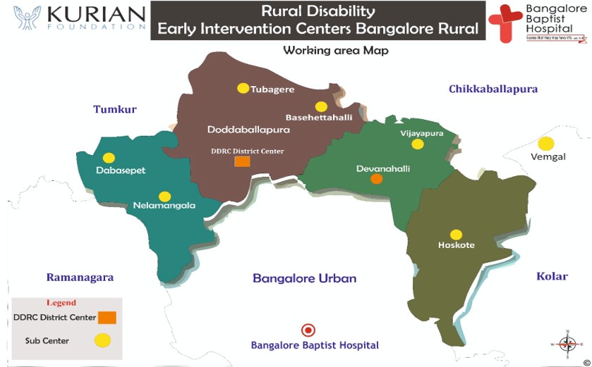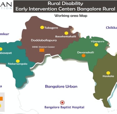Early detection and timely intervention can change the course of a child's life. With this vision, nine Rural Disability Early Intervention and Rehabilitation Centres have been established across the four taluks of Nelamangala, Doddaballapura, Devanahalli, and Hoskote—located in Dobbaspet, Nelamangala, Tubagere, Basahettahalli, Devanahalli, Vijapura, Hoskote, Vemgal, and DDRC (Doddaballapura).